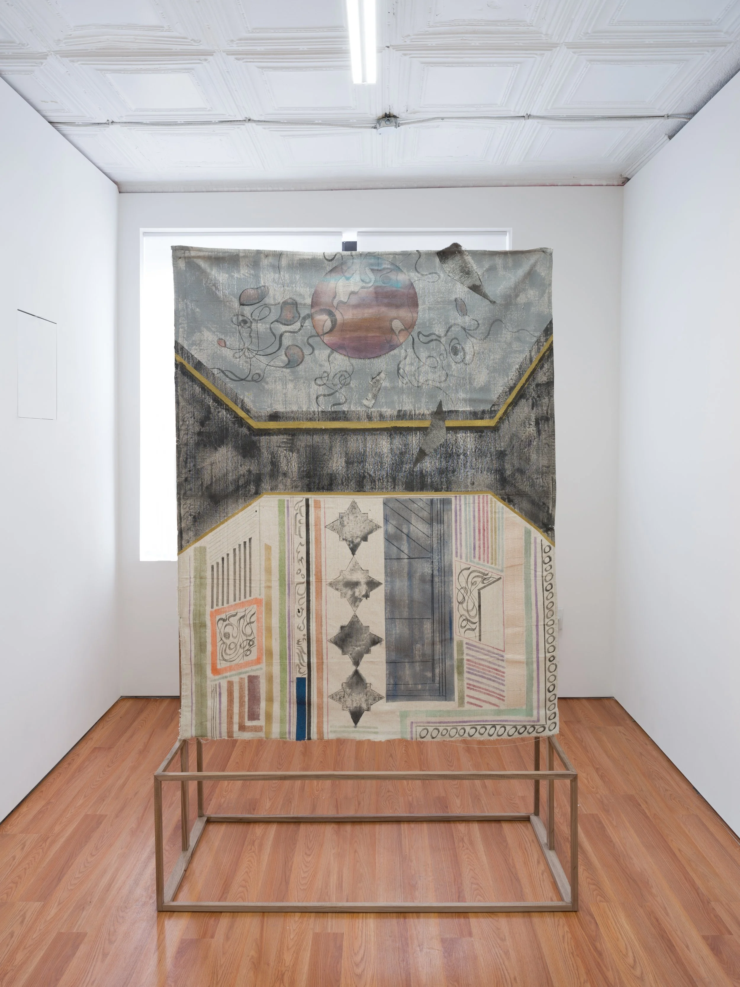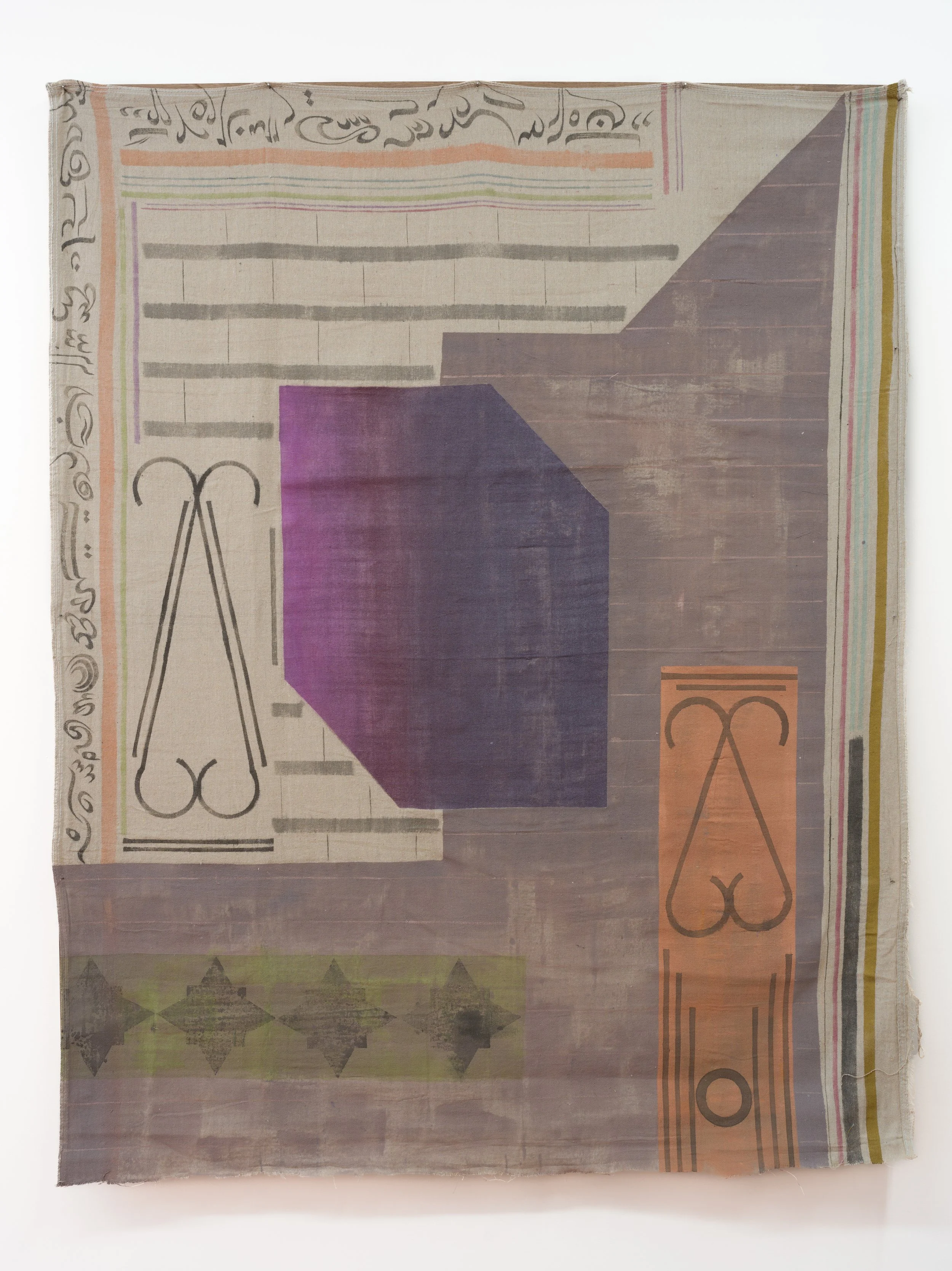 Ferforje, 2023, natural and fabric dyes, acrylic, spray paint, ink, print and fabric collage on raw canvas, 70 x 54 inches